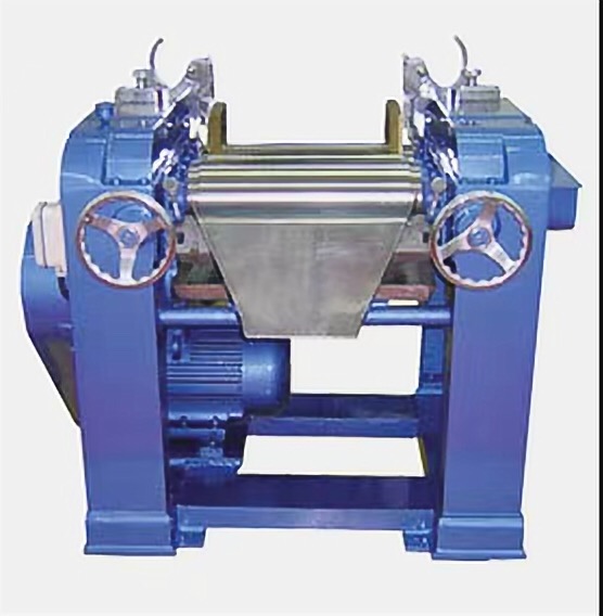 該設(shè)備由三個輥筒組成,裝在一個機架上,由電機直接帶動。一般輥筒間的轉(zhuǎn)動方向不同,前輥向前轉(zhuǎn)動,中輥向后轉(zhuǎn)動。輥子轉(zhuǎn)速前輥快、后輥慢。中間輥固定,前后兩輥裝在滑道上,有彈簧裝置,用手輪調(diào)節(jié)前后輥與中輥的距離。物料由后輥與中輥之間進入,受到輥筒的擠壓,產(chǎn)品顆粒變細,然后由快輥帶出,快輥末端裝有刮刀,使物料與輥筒分離,落入收集桶內(nèi)。由于研磨過程產(chǎn)生大量熱量,各輥筒的中心是設(shè)計為空心結(jié)構(gòu),通水冷卻,保證產(chǎn)品質(zhì)量。